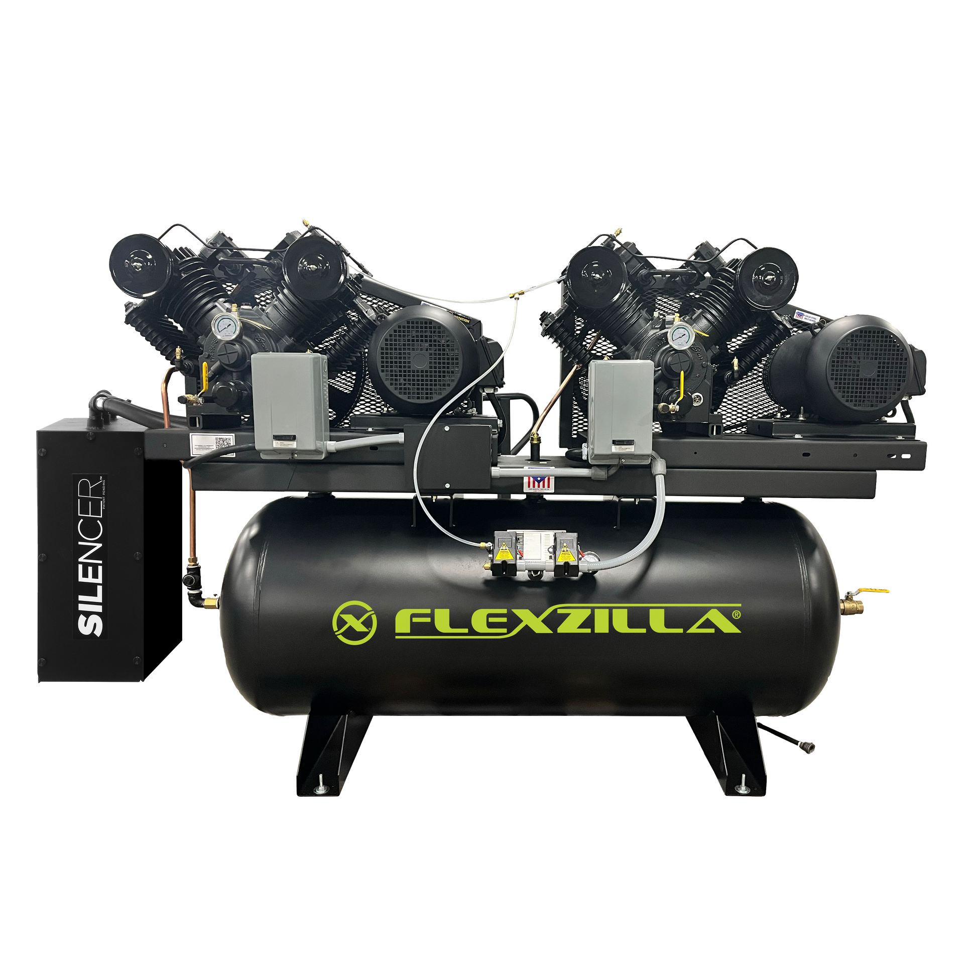 Get industrial-grade air power without the noise. The Flexzilla Silent Duplex Compressor combines the patented Silencer™ noise suppression system with Quiet Technology™ low-RPM pumps and motors to keep sound levels low while delivering the CFM output your shop demands. The alternating motor design ensures continuous operation, and Cool Flow Technology™ circulates ambient air around the tank to reduce heat and moisture — extending the life of your equipment. Backed by an industry-best Lifetime Pump Warranty.