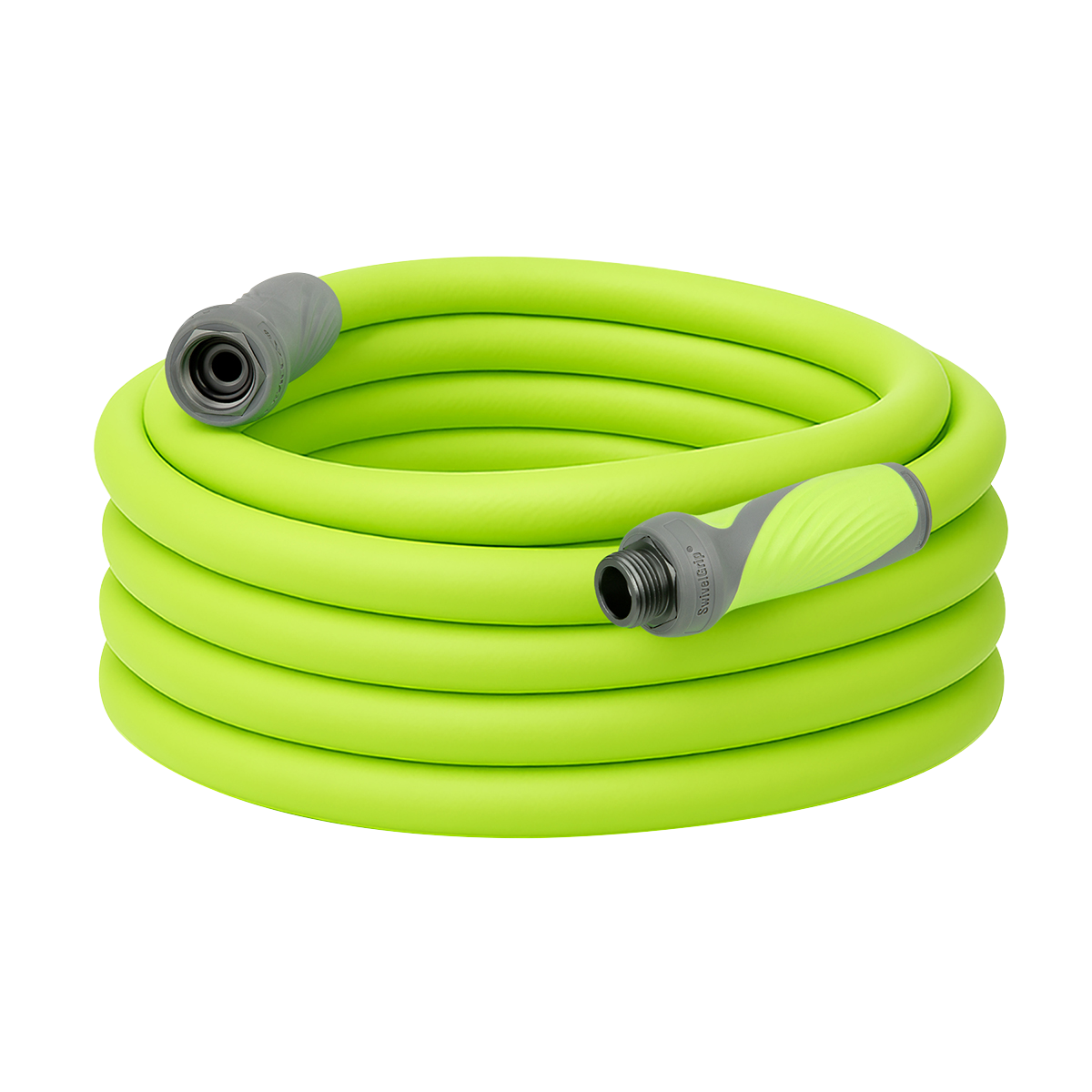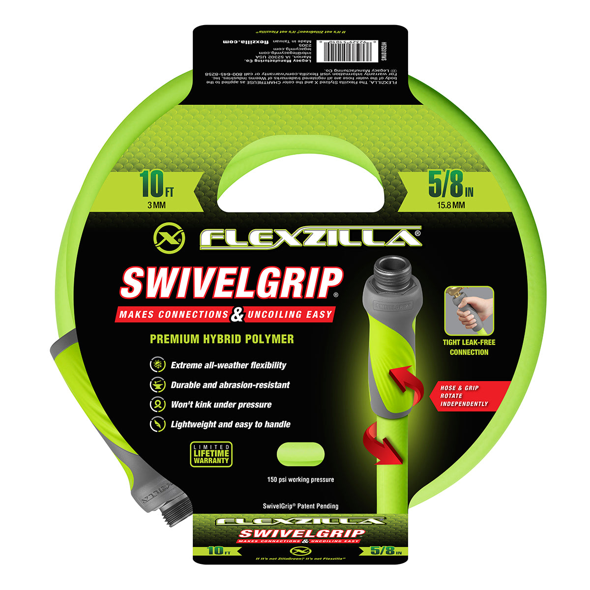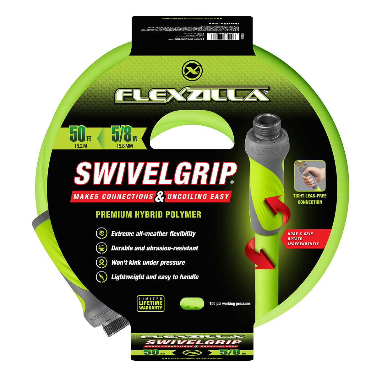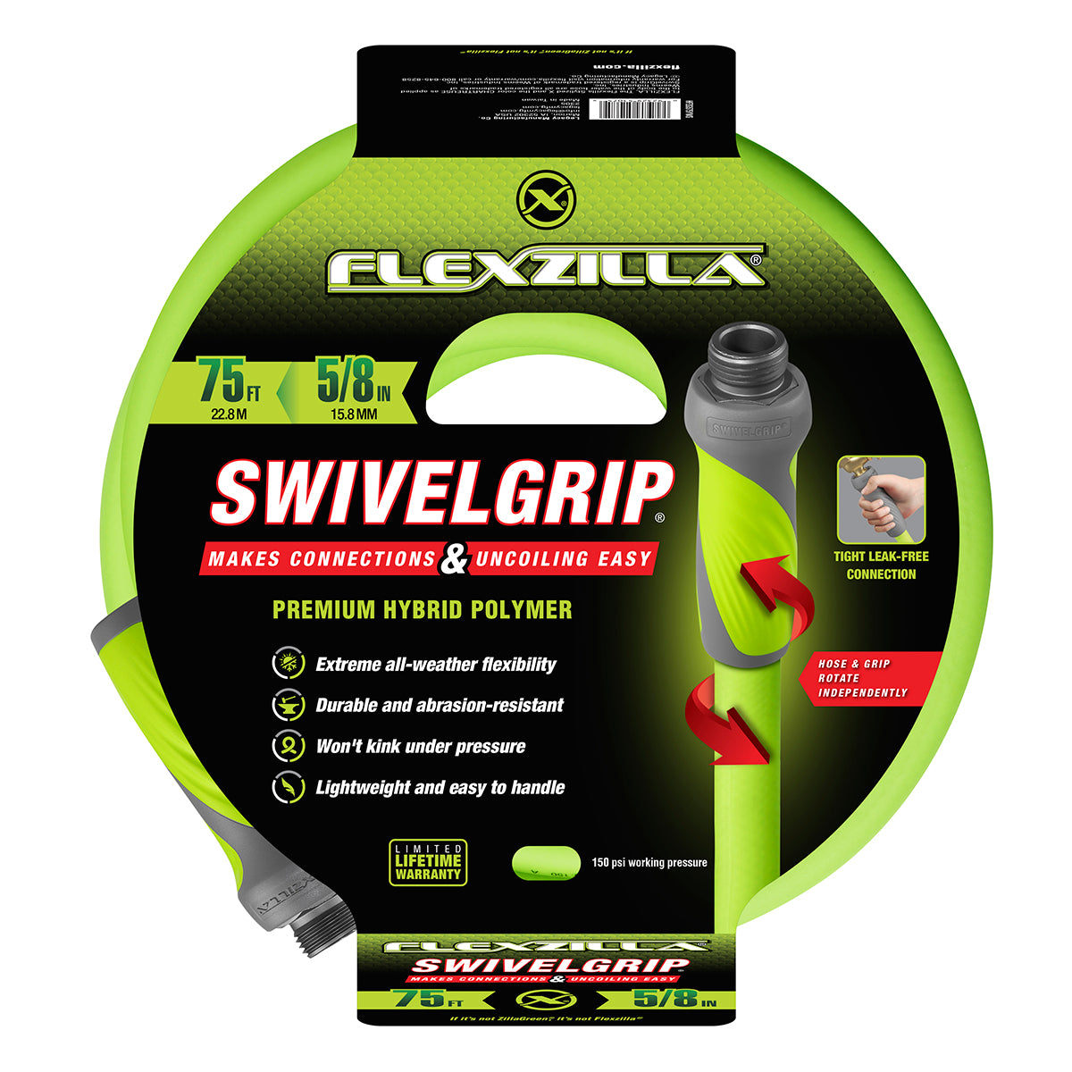 Premium Flexzilla® SwivelGrip® Garden Hose makes it easier to work around your home and lawn. SwivelGrip® action eliminates twists that occur when uncoiling a hose. Conventional garden hose can trap coils that tighten into kinks as you move across the yard. SwivelGrip® allows the hose and grip to rotate independently, releasing coils naturally, easily and effortlessly. The large, comfortable gripping surface on both ends of the hose lets you use the power of your entire hand to make tight connections easy. Flexzilla® SwivelGrip® Garden Hoses are engineered with a lightweight Flexible Hybrid Polymer which lays flat and eliminates kinking under pressure.